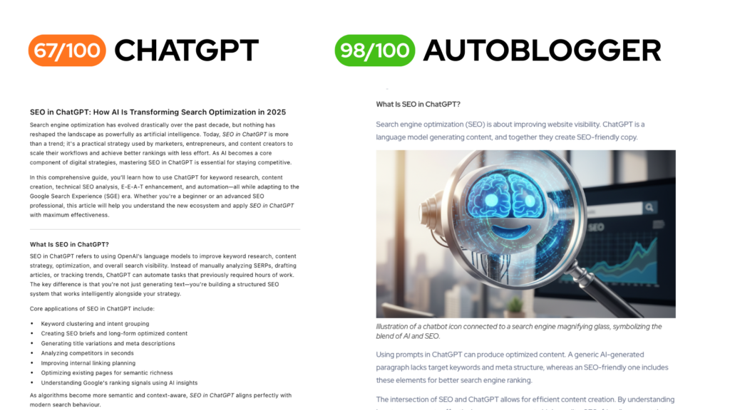AutoBlogger ensures your primary keyword, such as website ranking improvement, is perfectly integrated throughout the content.